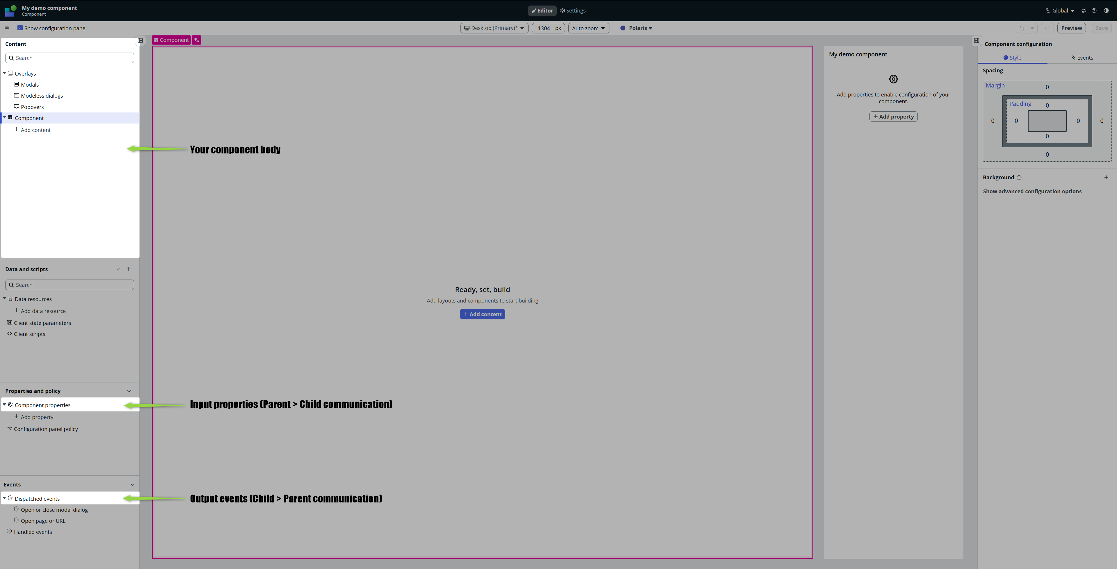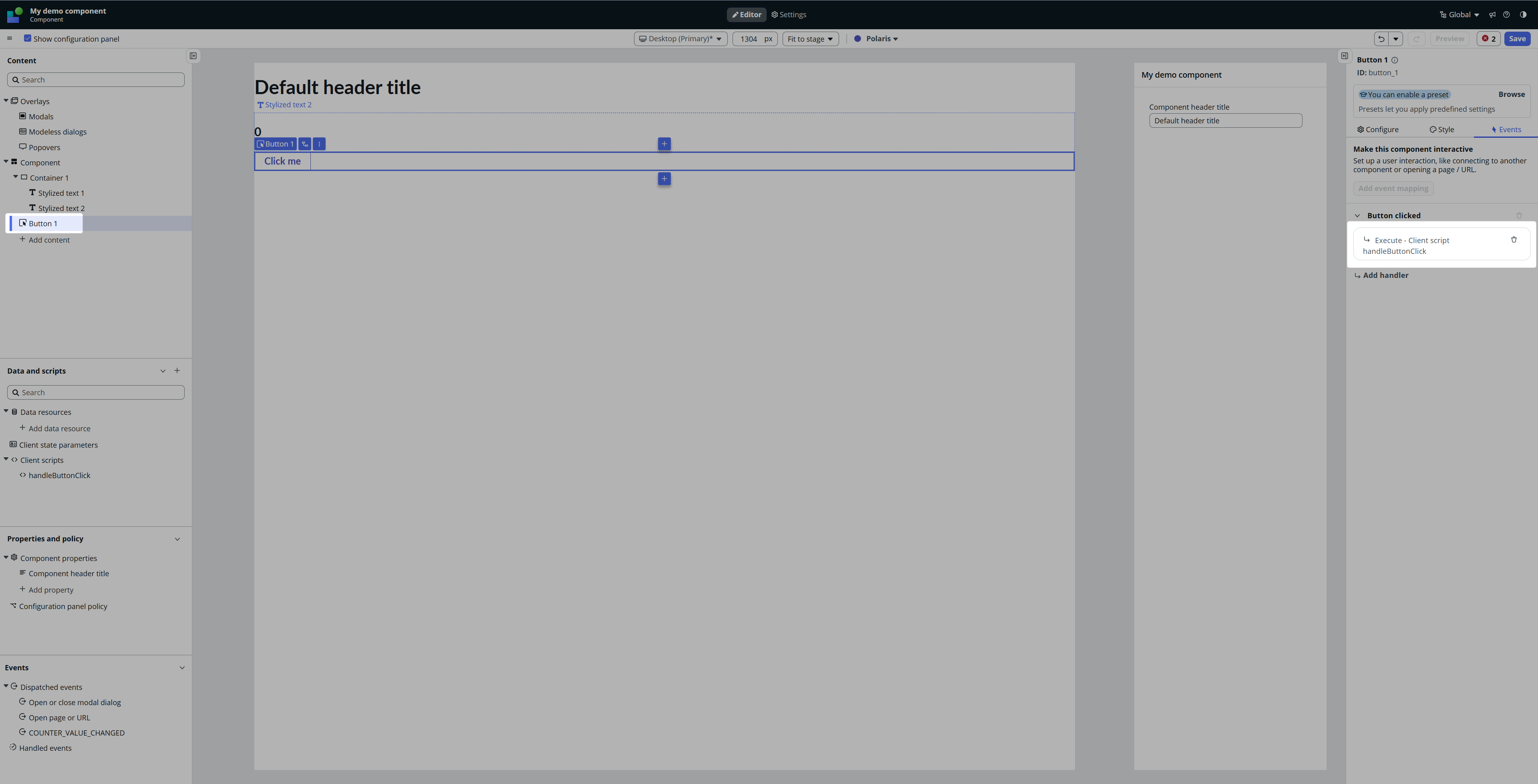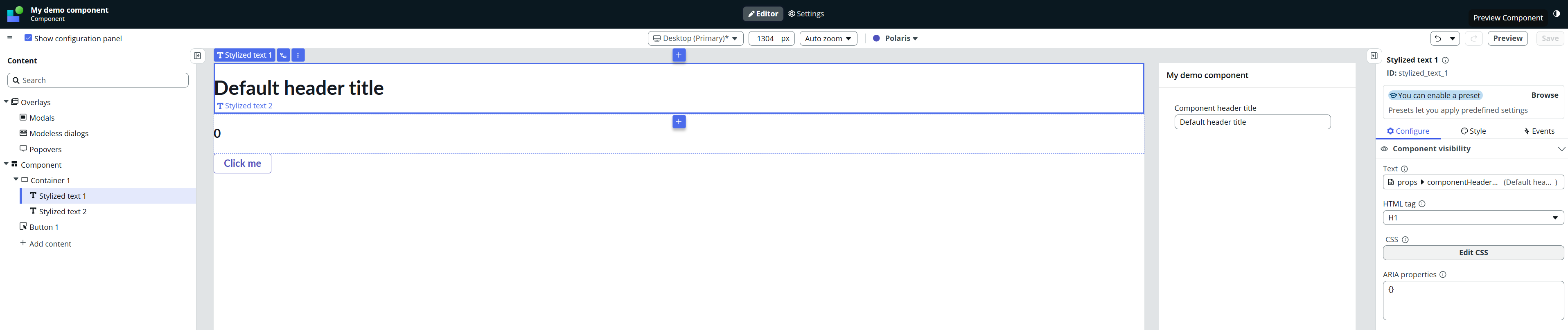 I’ll create a very simple component: as an Input, there will be text for the Header of the component, the component itself will be a counter (counting +1 on button click), and each click will dispatch an event so the Parent can handle it.