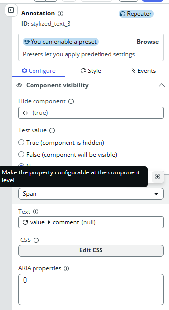 Similarly, if you want to bind a property of an existing component (like Stylized text) to an input property of your custom component, you can now create that input property right from the data binding menu.